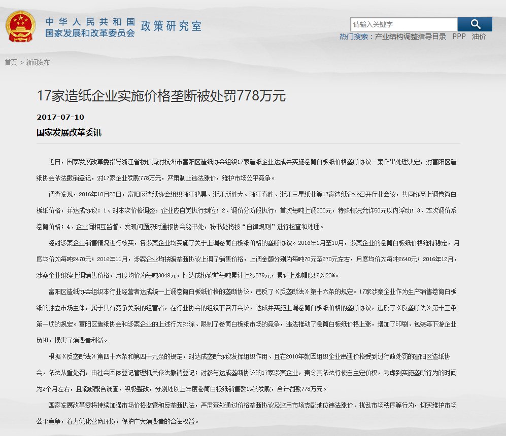 紙價瘋漲,發改委出手了,17家造紙企業因實施價格壟斷被罰778萬元