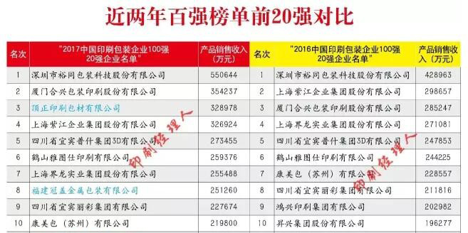2017年榜單中,深圳市裕同包裝科技股份有限公司以55.06億元蟬聯榜首,銷售收入較上一年同比增長28.37%。在過去的2016年,裕同科技成功登陸深市中小企業板,成為國內印刷包裝業市值最大的上升公司。良好的發展勢頭,也助力裕同成為百強榜單中首家年銷售收入沖過50億元的印刷包裝企業。